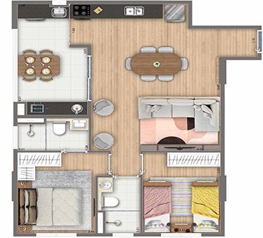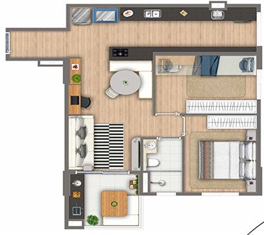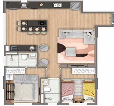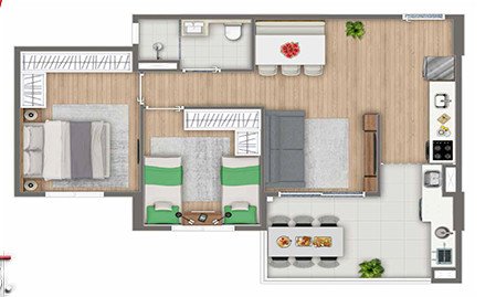 São apartamentos de 33,88 m² ( Studio ), apartamentos de 40,93, 44,69 m², 56,23 e 58,07 m² com 2 dormitórios, varanda e vaga e 61,31 m² com suíte 2 dormitórios, varanda e 2 vagas.